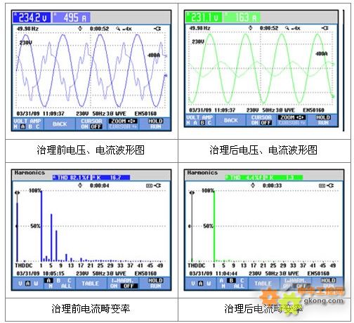 投入有源電力濾波器運行後,總電流畸變率由82.1%降至4.4%、5次諧波的電流畸變率由67.0%降至1.9%、7次諧波的電流畸變率由43.8%降至2.0%。電dian網wang質zhi量liang得de到dao明ming顯xian的de改gai善shan,並bing且qie適shi用yong於yu變bian化hua較jiao快kuai的de負fu載zai,對dui供gong電dian係xi統tong的de非fei線xian性xing負fu載zai在zai工gong作zuo過guo程cheng中zhong產chan生sheng的de諧xie波bo起qi到dao明ming顯xian的de抑yi製zhi作zuo用yong,從cong根gen本ben上shang改gai善shan了le整zheng個ge供gong電dian係xi統tong的de電dian能neng質zhi量liang狀zhuang況kuang,有you效xiao地di保bao護hu了le生sheng產chan線xian上shang設she備的正常運行。