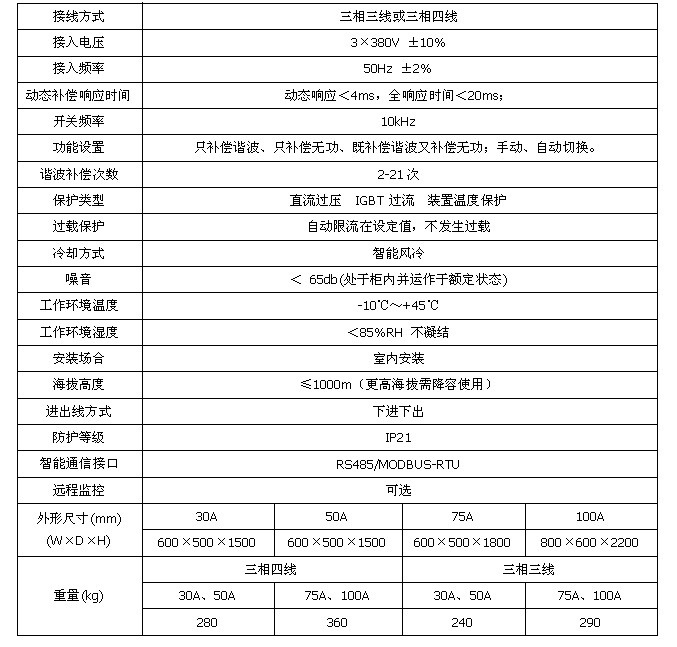 3.4 技術優勢 - DSP+FPGA全數字控製方式,具有極快的響應時間; - 先進的主電路拓撲和控製算法,精度更高、運行更穩定; - 一機多能,既可補諧波,又可兼補無功; - 模塊化設計,便於生產調試 - 便利的並聯設計,方便擴容; - 具有完善的橋臂過流、保護功能; - 使用方便,易於操作和維護。