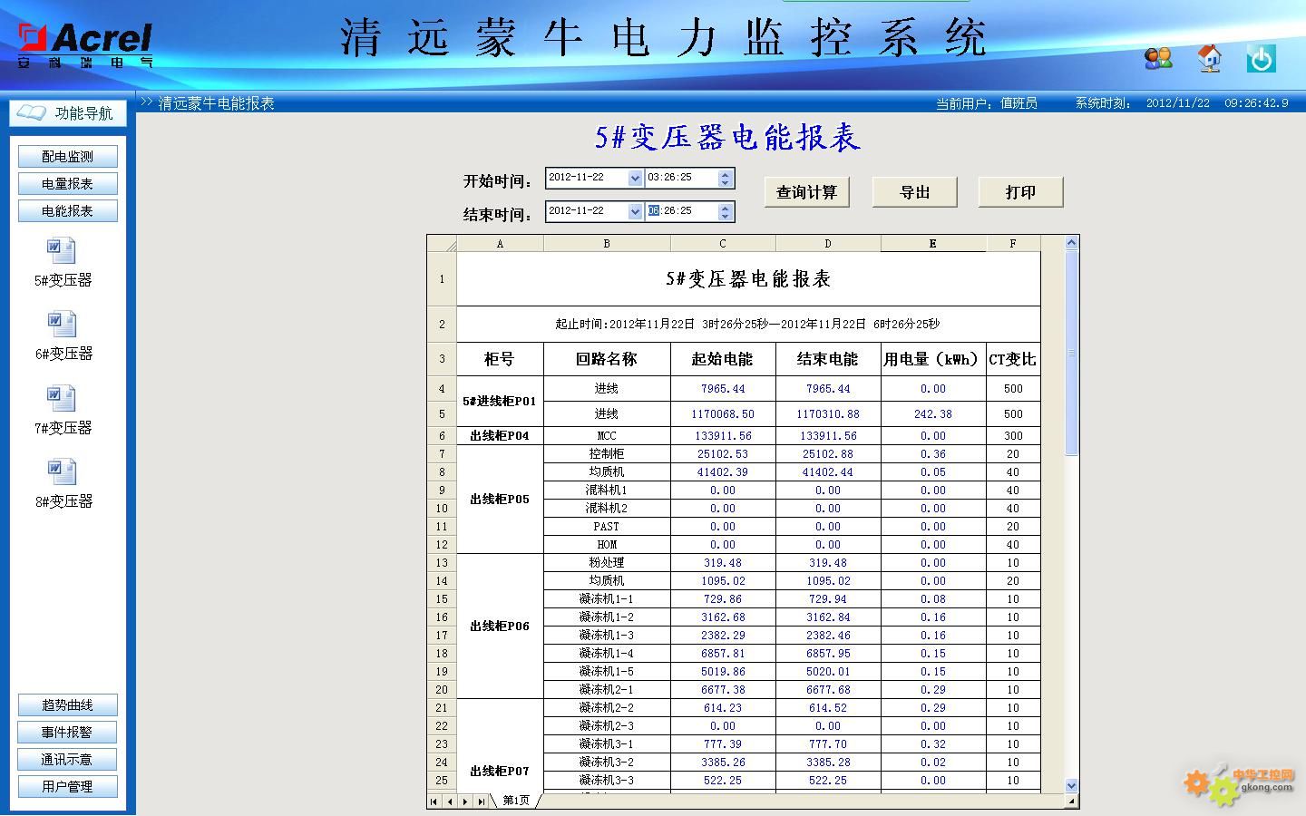 用電量報表功能,可選擇時間段進行查詢,支持任意時間段電度累(lei)計(ji)查(zha)詢(xun),具(ju)備(bei)數(shu)據(ju)導(dao)出(chu)和(he)報(bao)表(biao)打(da)印(yin)等(deng)功(gong)能(neng)。為(wei)值(zhi)班(ban)人(ren)員(yuan)提(ti)供(gong)了(le)精(jing)確(que)可(ke)靠(kao)的(de)電(dian)能(neng)報(bao)表(biao)。該(gai)報(bao)表(biao)各(ge)回(hui)路(lu)名(ming)稱(cheng)和(he)數(shu)據(ju)庫(ku)關(guan)聯(lian),方(fang)便(bian)用(yong)戶(hu)修(xiu)改(gai)回(hui)路(lu)名(ming)稱(cheng),用(yong)戶(hu)可(ke)以(yi)直(zhi)接(jie)打(da)印(yin)報(bao)表(biao),可(ke)以(yi)以(yi)EXCEL格式另存到其他位置,圖(7)為5#變壓器回路用電報表統計。