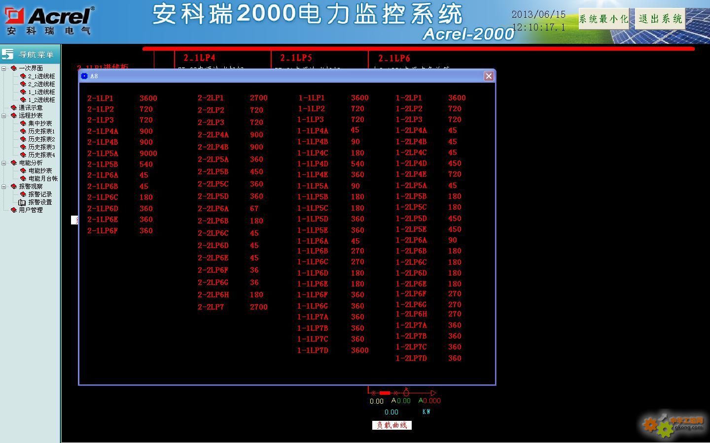 負fu荷he趨qu勢shi曲qu線xian界jie麵mian中zhong可ke直zhi觀guan的de查zha看kan回hui路lu的de負fu荷he運yun行xing情qing況kuang。通tong過guo點dian擊ji一yi次ci圖tu上shang麵mian的de符fu合he曲qu線xian按an鈕niu,即ji可ke對dui應ying查zha看kan該gai回hui路lu的de實shi時shi和he曆li史shi趨qu勢shi曲qu線xian,點dian擊ji畫hua麵mian相xiang應ying按an鈕niu或huo菜cai單dan項xiang可ke以yi完wan成cheng相xiang應ying功gong能neng的de切qie換huan;幫助用戶進線趨勢分析和故障追憶,具備曲線打印功能。為分析整個係統的運行狀況提供了直觀而方便的軟件支持,見圖(12)。