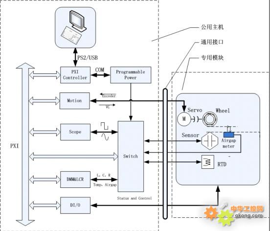 就目前的市場來看,汽車傳感器沒有一個統一的行業標準,基本上都是按照使用者的要求定製的,譬如目標輪及其轉速、空(kong)氣(qi)氣(qi)隙(xi)和(he)傳(chuan)感(gan)器(qi)的(de)安(an)裝(zhuang)尺(chi)寸(cun)各(ge)不(bu)相(xiang)同(tong),即(ji)使(shi)是(shi)傳(chuan)感(gan)器(qi)裝(zhuang)配(pei)到(dao)同(tong)一(yi)種(zhong)車(che)型(xing)上(shang),也(ye)會(hui)隨(sui)著(zhe)安(an)裝(zhuang)位(wei)置(zhi)的(de)不(bu)同(tong)而(er)存(cun)在(zai)差(cha)異(yi)。那(na)麼(me),同(tong)一(yi)台(tai)設(she)備(bei)不(bu)可(ke)能(neng)滿(man)足(zu)全(quan)部(bu)傳(chuan)感(gan)器(qi)的(de)測(ce)試(shi)要(yao)求(qiu),由(you)此(ci)引(yin)入(ru)模(mo)塊(kuai)化(hua)的(de)設(she)計(ji)思(si)想(xiang),即(ji)係(xi)統(tong)中(zhong)相(xiang)同(tong)的(de)部(bu)分(fen),如(ru)測(ce)試(shi)儀(yi)器(qi)、測試軟件、氣動控製係統、主電路係統,作為公用資源(這裏我們稱之為“主機”);對於係統中要求隨著傳感器變化的部分,如目標輪及馬達、夾jia具ju及ji專zhuan用yong電dian路lu,作zuo為wei模mo塊kuai的de形xing式shi。主zhu機ji和he模mo塊kuai之zhi間jian采cai用yong快kuai插cha的de方fang式shi完wan成cheng電dian氣qi的de連lian接jie,並bing且qie接jie口kou標biao準zhun化hua,滿man足zu後hou續xu的de擴kuo展zhan需xu求qiu。當dang測ce試shi不bu同tong傳chuan感gan器qi時shi選xuan用yong不bu同tong的de測ce試shi模mo塊kuai連lian接jie到dao主zhu機ji上shang即ji可ke(如圖1)。