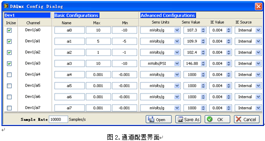 PCI-4472總共支持8通道的數據采集,在通道數上能夠滿足附加測試的需求(加速度3通道,油壓1通道),而NI 提供的驅動―DAQmx,也為實現在軟件層麵上配置采集參數創造了條件。應用程序提供了如圖2所示的通道配置界麵。