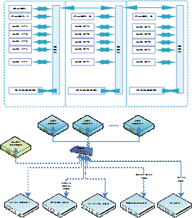 需的功能模塊進行組合,具有良好擴展性,實現多工位並行測試,甚至能夠對多類產品的並行測試。滿足民用、軍用等不同領域的需求,如圖,是三個機櫃的結構,平台最高可以支持8個子機櫃係統的擴展能力。整個測試係統基於PXIe總線實現,每個槽位可擴展到2GB/s的帶寬能夠滿足射頻、雷達等電路板的實時測試需求。