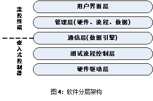 - 測試流程控製層:這zhe一yi層ceng是shi執zhi行xing端duan層ceng次ci的de核he心xin結jie構gou,負fu責ze解jie析xi管guan理li層ceng的de配pei置zhi信xin息xi和he命ming令ling參can數shu並bing控kong製zhi程cheng序xu按an照zhao用yong戶hu配pei置zhi的de測ce試shi流liu程cheng執zhi行xing。同tong時shi向xiang硬ying件jian驅qu動dong層ceng發fa送song指zhi令ling和he提ti取qu數shu據ju、分析數據,將原始數據和處理結果傳送到通信層。