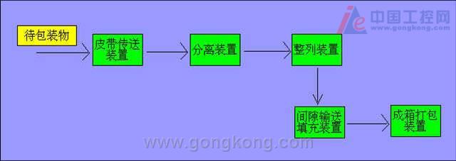 3. 方案 一台自動裝箱機,包括:皮帶輸送裝置、分離裝置、整列裝置、間隙輸送填充裝置、成箱打包裝置,各裝置都安裝在同一主機架上。