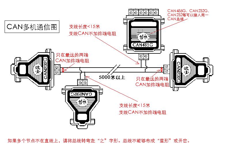 此方案不僅可以解決RS-232/RS-485點對點通信,而且還可以組成帶有節點的總線製結構,此種通信方式和通常的RS-485總線類似,在網絡中每個掛有型號為CAN232G的RS-232光隔超遠程驅動器的RS-232接口設備,或者掛接波士電子生產的型號為CAN485G的 RS-485光隔超遠程驅動器的RS-485設備,均可與上位主控計算機以輪詢的方式通信。