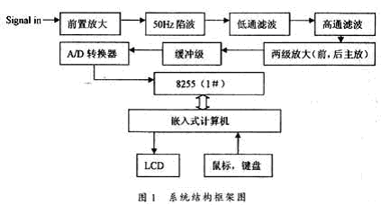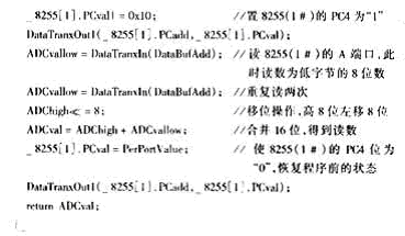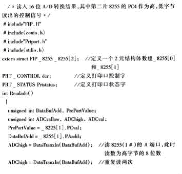 係統同時采用兩片可編程並行通信接口芯片8255(0#)和8255(1#),其中8255(0#)控製模擬電路部分,8255(1#)讀取A/D轉換以後數據。A/D轉換器采用高精度ADS8705。ADS8705轉換出來的數據一共是16位,而並行口一次能夠傳輸的數據隻有8位,所以數據分高低字節兩次讀取。把8255(0#)的PC4與ADS8705的BYTE位wei相xiang連lian作zuo為wei讀du取qu高gao低di字zi節jie數shu據ju的de控kong製zhi信xin號hao。係xi統tong緩huan衝chong級ji部bu分fen采cai用yong射she極ji放fang大da器qi,具ju有you輸shu入ru電dian阻zu大da,而er輸shu出chu電dian阻zu小xiao的de特te點dian,大da大da地di增zeng強qiang了le整zheng個ge係xi統tong的de穩wen定ding性xing和he抗kang幹gan擾rao能neng力li。 2軟件實現 本係統軟件部分采用C語言和彙編語言混合編程完成,工作平台在MicroSoft C6.0提供的程序員工作平台(PWB)shangshixian。xitongdedianlubufenzhuyaowanchengshujucaiji,zhuanhuanhechuansongdenggongneng,erqianrushijisuanjichuleduizhenggemonibufenjinxingkongzhiwai,haiwanchengduishujudechulihejieguofenxi,bingjiangjieguoxianshidaoLCD屏供觀測分析。 下麵給出部分程序: