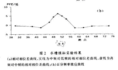 3模擬實驗分析 實驗中選擇碳質黃銅礦作為觀測對象,整個標本形狀不甚規則,體積約為5cm×5cm×5cm。實shi驗yan中zhong我wo們men先xian給gei標biao本ben供gong電dian,使shi其qi產chan生sheng電dian激ji發fa效xiao應ying,然ran後hou發fa送song機ji向xiang水shui槽cao同tong時shi發fa送song高gao,中zhong,低di三san個ge不bu同tong頻pin率lv信xin號hao作zuo為wei觀guan測ce信xin號hao,由you於yu不bu同tong的de礦kuang物wu成cheng分fen對dui其qi有you不bu同tong的de表biao現xian特te性xing,接jie收shou機ji可ke以yi檢jian測ce到dao這zhe些xie信xin號hao的de微wei弱ruo差cha別bie。檢jian測ce到dao的de信xin號hao經jing過guo傅fu立li葉ye變bian換huan後hou可ke以yi有you效xiao的de轉zhuan變bian為wei要yao觀guan測ce的de相xiang對dui相xiang位wei差cha,百bai分fen頻pin率lv效xiao應ying等deng幾ji個ge參can數shu。部bu分fen參can數shu在zai嵌qian入ru式shi計ji算suan機ji提ti供gong的deWindows98平台上用sufer作圖軟件處理後的結果如圖2所示:(a)為(wei)相(xiang)對(dui)相(xiang)位(wei)的(de)異(yi)常(chang)曲(qu)線(xian),圖(tu)中(zhong)顯(xian)示(shi)中(zhong)頻(pin)對(dui)低(di)頻(pin)相(xiang)對(dui)相(xiang)位(wei)差(cha)與(yu)高(gao)頻(pin)對(dui)中(zhong)頻(pin)的(de)相(xiang)對(dui)相(xiang)位(wei)差(cha)的(de)位(wei)置(zhi)變(bian)化(hua)可(ke)以(yi)反(fan)映(ying)激(ji)電(dian)異(yi)常(chang)的(de)性(xing)質(zhi)的(de)不(bu)同(tong),進(jin)而(er)區(qu)分(fen)出(chu)異(yi)常(chang)源(yuan)的(de)物(wu)理(li)特(te)性(xing)的(de)不(bu)同(tong)。(b)為百分比頻率效應的曲線圖,由於不同礦物成分的電阻率的不同,反映出來就是百分比頻率效應的變化。圖中(a)和(b)曲線均在標本正上方出現異常的峰值,與實際情況相符。