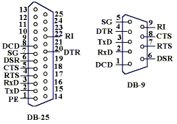 PC機常用的RS232串口DB9(公型插座)和DB25(母型插座)接頭如下所示: