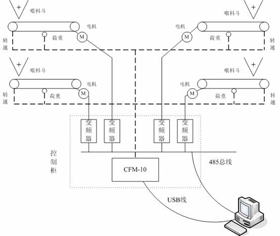連續配料自動控製係統 一,概述: 連續配料係統在水泥、煤炭、冶金、化工、飼料、食品等行業有很廣泛的應用。澳德公司利用公司在數據采集、控製技術和組態軟件上的優勢開發的CFS-10是專門為連續配料係統設計的OEM自動化係統。具有功能全麵,靈活性強,性價比高等特點,受到連續配料係統集成商和用戶的歡迎。 CFS-10shigegaoxingjiabidexitong。peiliaoxitongyibanyouduotaipidaijizucheng,chuantongdefangfashiyitaipidaijipeizhiyitaokongzhiqi,ranhoubakongzhiqiliandaojisuanjishang。eryigeCFS-10係統可以同時控製多台皮帶機,從而大大降低了係統的造價。 CFS-10是個高可靠性的係統。它具有計算機和控製器相互監視的機製和多種報警機製,控製器的核心采用了美國高可靠性的LabJack U12。即使在計算機死機情況下,係統不但會發出報警信號,而且還可以按照原先的狀態繼續運行。 CFS-10係統靈活性強。它可以和各種品牌、規格的變頻器、傳感器接口,使係統對設備的選擇有很大的靈活性。計算機上的監控軟件使用美國的DAQFactory組態軟件。該軟件在Windows下的線程管理十分可靠,軟件具有動畫功能和PID控製功能。組態軟件的靈活性使得該係統的個性化更為簡單、便捷,可以方便地根據用戶的不同需要定製界麵和操作流程。 CFS-10是一個功能全麵的係統。它支持多媒體報警機製,當故障發生時,如皮帶打滑、缺料、電(dian)機(ji)故(gu)障(zhang)等(deng),係(xi)統(tong)可(ke)以(yi)通(tong)過(guo)喇(la)叭(ba)發(fa)出(chu)各(ge)種(zhong)警(jing)報(bao)聲(sheng),或(huo)進(jin)行(xing)語(yu)音(yin)報(bao)警(jing)。在(zai)一(yi)般(ban)情(qing)況(kuang)下(xia)用(yong)戶(hu)隻(zhi)要(yao)通(tong)過(guo)點(dian)擊(ji)鼠(shu)標(biao)即(ji)可(ke)對(dui)係(xi)統(tong)進(jin)行(xing)各(ge)種(zhong)操(cao)作(zuo)。配(pei)料(liao)比(bi)例(li)可(ke)以(yi)隨(sui)時(shi)進(jin)行(xing)改(gai)變(bian),改(gai)變(bian)一(yi)個(ge)物(wu)料(liao)的(de)比(bi)例(li)時(shi),其(qi)它(ta)比(bi)例(li)會(hui)根(gen)據(ju)它(ta)們(men)原(yuan)來(lai)的(de)比(bi)例(li)自(zi)動(dong)做(zuo)出(chu)相(xiang)應(ying)的(de)調(tiao)整(zheng),保(bao)證(zheng)了(le)總(zong)配(pei)比(bi)為(wei)100%,從而保證了產品的質量和產量。 生sheng產chan數shu據ju記ji錄lu是shi該gai係xi統tong的de另ling一yi個ge特te點dian。所suo有you的de數shu據ju都dou可ke以yi進jin行xing保bao存cun,但dan為wei了le保bao證zheng數shu據ju的de效xiao率lv,默mo認ren數shu據ju保bao存cun方fang式shi是shi時shi間jian驅qu動dong型xing的de,即ji當dang配pei比bi被bei修xiu改gai時shi、發生警報時或其他預先定義的事件發生時。係統還提供統計數據的查詢,如產量報表。 數shu據ju查zha詢xun不bu但dan可ke以yi在zai本ben地di實shi現xian,也ye可ke以yi在zai任ren何he聯lian網wang的de計ji算suan機ji上shang進jin行xing。數shu據ju查zha詢xun為wei分fen類lei查zha詢xun,而er且qie不bu需xu要yao安an裝zhuang任ren何he其qi他ta軟ruan件jian,隻zhi要yao使shi用yong互hu聯lian網wang瀏liu覽lan器qi便bian可ke。大da大da方fang便bian了le使shi用yong,使shi生sheng產chan的de原yuan始shi數shu據ju得de到dao有you效xiao的de應ying用yong,實shi現xian產chan業ye信xin息xi化hua的de目mu的de。 二,係統結構: CFS-10由一台工控機、一yi套tao外wai置zhi的de數shu據ju采cai集ji控kong製zhi器qi和he變bian頻pin器qi組zu成cheng。數shu據ju采cai集ji控kong製zhi器qi采cai集ji皮pi帶dai秤cheng來lai的de荷he重zhong信xin號hao和he皮pi帶dai走zou速su信xin號hao,以yi及ji機ji器qi的de開kai關guan狀zhuang態tai和he故gu障zhang信xin號hao。計ji算suan機ji對dui采cai集ji的de信xin號hao進jin行xing分fen析xi,再zai根gen據ju用yong戶hu輸shu入ru的de配pei比bi和he生sheng產chan量liang的de要yao求qiu通tong過guo485接口向變頻器輸出指令來控製各皮帶機的走速。係統結構如圖所示。