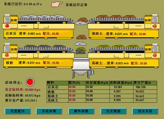主zhu界jie麵mian顯xian示shi了le各ge物wu料liao設she定ding的de配pei比bi,各ge物wu料liao的de實shi時shi傳chuan輸shu速su率lv,各ge物wu料liao的de實shi時shi流liu量liang,各ge物wu料liao累lei計ji產chan量liang,物wu料liao實shi際ji總zong流liu量liang,物wu料liao實shi際ji總zong產chan量liang,皮pi帶dai機ji運yun行xing指zhi示shi燈deng,警jing報bao信xin息xi(在發生警報時才會顯示)等。整個係統有一個總控製開關,而各皮帶機又有其單獨的控製開關,這使係統操作具有靈活性。界麵下方是其它控製功能。 在設置配比界麵上點擊一個物料(紅色的文本)即可修改該配料的比例。其它物料的配比將根據原先設定的配比自動進行調節,使其它各物料配比保持不變,且總配比保持100%不變。 在係統參數設置界麵上可以設置缺料報警閾值。當荷重傳感器測量值小於缺料報警閾值時,可以選擇係統停止工作和聲光報警。 硬件參數設置界麵用來標定荷重傳感器和皮帶機。 數據查詢界麵用來查詢報警、事件記錄等曆史數據。查詢時先設定開始和結束時間,數據類別,然後點擊查詢按扭查詢數據。