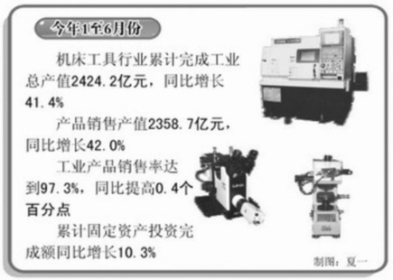 中國機床工具工業協會近日公布的2010年上半年我國機床工具工業運營統計數據顯示,上半年以來,我國機床工具行業工業總產值持續高速增長。據統計,今年1至6月份,機床工具行業累計完成工業總產值2424.2億元,同比增長41.4%;產品銷售產值2358.7億元,同比增長42.0%;工業產品銷售率達到97.3%,同比提高0.4個百分點;累計固定資產投資完成額同比增長10.3%。