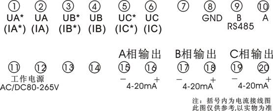 UA與UA*為第一路電壓輸入,UB與UB*為第二路電壓輸入,UC與UC*為第三路電壓輸入,三路電壓通道為相互獨立的,輸入信號量程請參見產品標簽。
