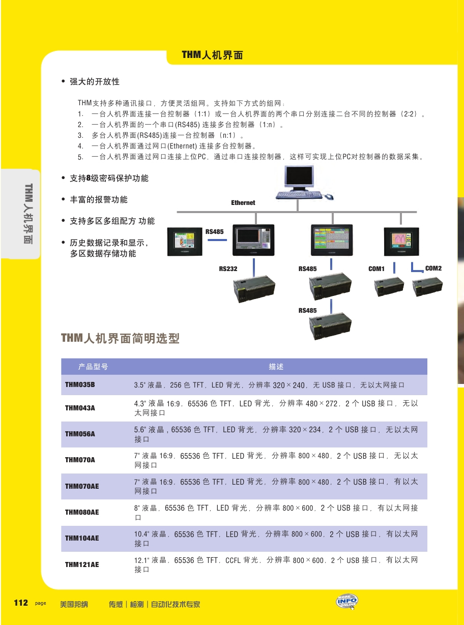 THM人機界麵性能卓越,外觀精美,產品係列齊全。它采用先進的嵌入式技術,高效的實時操作係統,簡單易用的操作軟件。除了具有監視、操作、儲存數據的基本功能外,還支持與大多數品牌的控製器、PLC、變頻器等設備的通訊。在工廠自動化和過程自動化的各個領域都有廣泛的應用。