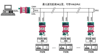 采用德陽四星電子技術開發中心研發的CAN-485G可解決以上問題,該產品並不需改變原有的通訊協議和軟件,可將FX2N-485-BD的通訊距離擴大到10公裏(4800bps時,9600bps時可達5公裏),組網的PLC可增至110台(實際上受PLC內部係統軟件的限製,軟件最多隻能支持16台PLC聯網),由於該產品采用了光電隔離,大大提高了係統的抗幹擾能力和安全性能。關於CAN總線和RS485的優劣比較,可參閱"基於RS232協議的CAN總線網絡",下圖為在FX2N-485-BD上使用CAN-485G組成的主從式通訊網絡: