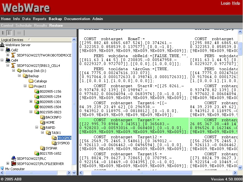 WebWare備bei份fen模mo塊kuai不bu需xu中zhong斷duan生sheng產chan就jiu能neng對dui機ji器qi人ren係xi統tong進jin行xing自zi動dong備bei份fen。備bei份fen計ji劃hua方fang式shi靈ling活huo,您nin可ke對dui機ji器qi人ren隨sui意yi編bian組zu,然ran後hou對dui每mei組zu機ji器qi人ren分fen別bie備bei份fen。各ge組zu機ji器qi人ren可ke采cai用yong不bu同tong的de備bei份fen間jian隔ge周zhou期qi,可ke每mei天tian備bei份fen、每周備份或每月備份。WebWare備份模塊可隨時訪問備份文檔,可將機器人程序、配置文件以及其它文件快速地恢複到機器人中。
