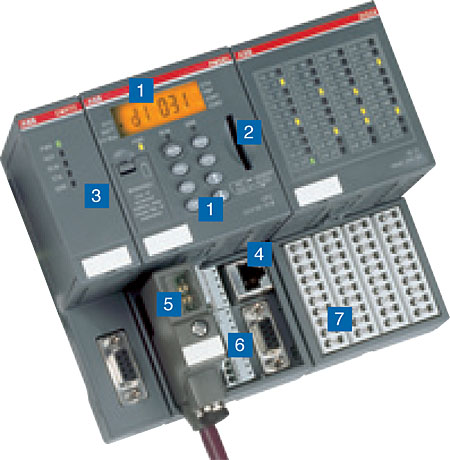 SD卡 可選附件,在沒有PC的情況下實現數據調用,下載和上傳用戶程式,或對所有設備進行產品更新(CPU、通訊模塊或I/O模塊)。 1 帶背光的LCD 顯示屏和操作按鍵 2 SD卡插槽 3 插入式擴展通訊模塊(從1個、2個最多至4個) 4 CPU上集成的通訊接口(可選為以太網或ARCNET) 5 FBP通訊接口(隻能用於從站) 6 兩個串行接口,用於編程、ASCII通訊、Modbus通訊,或CS31通訊(隻能用於主站) 7 本地I/O擴展模塊,最多到7 個