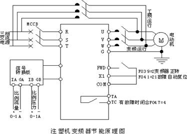 (3)應注意的問題: 變頻器有時會對注塑機的溫度控製造成諧波幹擾,應采取一定措施,如,保證設備良好接地;變頻器的輸入、輸出線繞磁環後再結入;對注塑機的控製電源采取隔離等。