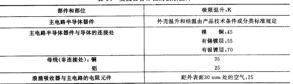 在GB/T3859.1-1993的“檢驗與實驗”中6.4.6“溫升試驗”中給出了具體要求:溫升試驗的目的在於測定變流器在額定條件下運行時各部件的溫升是否超過規定的極限溫升。半導體器件的溫升極限可以是規定點(例如外殼)的最高溫升,也可以是等效結溫,由製造廠決定。變流器各部位的極限溫升如下表: