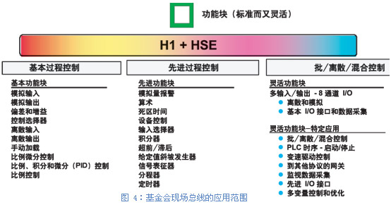 要實現分布式控製,諸如流量變送器中的模擬量輸入(AI)或閥門中的模擬量輸出(AO)應采用功能塊實現。比例、積分和微分(PID)控製功能也可以嵌入到功能塊中,並在現場設備中運行。如圖3所示,PID和AO塊在閥門中實現。對基本控製塊而言,輸入和輸出的數量和類型由基金會現場總線技術規範預定義。更複雜的功能,如批量控製、同步驅動控製、I/O網關和PLC時序,可采用特定的靈活功能塊(FFB)。FFB的輸入和輸出,以及FFB控製算法則由最終用戶組態。 設備測試和注冊 現場總線采用嚴格的測試以確認設備是否符合相應的技術規範,所有控製設備、設備描述文件、功能塊、通信棧和物理層都需加以確認,通過測試的設備將加上產品注冊的“校驗標記”。 最終用戶應選用通過現場總線測試程序的設備。通過設備注冊和主機HIST測試的設備清單列在現場總線網站上 www.fieldbus.org。 基金會現場總線的應用 圖4給出基金會現場總線的應用範圍。針對基本和先進過程控製應用場合,基金會現場總線列出21種標準功能塊,更多的功能塊仍在研發中。前麵提到的靈活功能塊(FFB)是一種針對特定應用場合而設計的功能塊,以實現各類控製策略,如監視數據采集、批量控製、PLC時序、鍋爐管理、同步驅動和先進I/O接口。FFB采用諸如IEC 61131-3標準的編程工具創建。FFB還可以將其他網絡的信息(如傳感器總線)傳送到基金會現場總線的開放結構中。