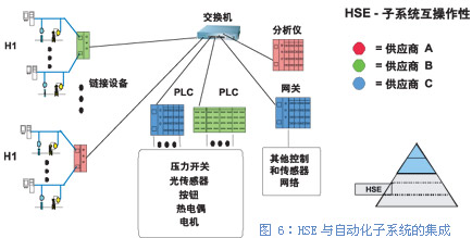 子係統集成 HSE與自動化子係統的集成如圖6所示。與現場設備集成後,子係統集成時無需客戶進行軟件編程。HSE是一種高性能主幹網,它采用低成本的工業標準以太網設備。鏈接設備將H1子係統集成到HSE主幹網中。
