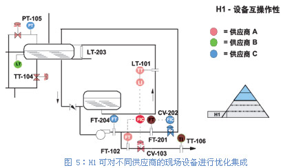 集成化和互操作性 互操作性對於工廠優化至關重要,因為它保證用戶能夠從多家供應商那裏獲得所需的各類設備。現場總線采用開放、集成化的現場總線結構體係,從而確保工廠結構中,設備層、子係統層和數據服務器層實現集成和互操作。 現場設備集成 如圖5所示,H1可對不同供應商的現場設備進行優化集成。由於采用功能塊、設備描述和通用通信棧技術,無需客戶進行軟件編程,注冊設備可在H1現場總線上實現“即插即用”。