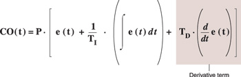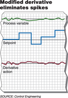圖2:在此例中,如果設置點僅以步進的方式改變,則微分無論怎樣都幾乎總是為零,因此可通過對過程變量負增長求導來計算微分作用。 微分作用 振蕩有時可通過向混合信號增加微分作用來予以矯正。全“比例-積分-微分”(PID)控製器中的微分項,隻有在誤差改變時才起作用。如果設置點為常數,則隻有在過程變量開始移向(或離開)設(she)置(zhi)點(dian)時(shi)誤(wu)差(cha)才(cai)開(kai)始(shi)改(gai)變(bian),而(er)這(zhe)在(zai)前(qian)麵(mian)的(de)控(kong)製(zhi)量(liang)使(shi)過(guo)程(cheng)變(bian)量(liang)接(jie)近(jin)設(she)置(zhi)點(dian)太(tai)快(kuai)時(shi)尤(you)其(qi)有(you)用(yong)。因(yin)此(ci),微(wei)分(fen)作(zuo)用(yong)所(suo)提(ti)供(gong)的(de)減(jian)速(su)作(zuo)用(yong)可(ke)減(jian)少(shao)產(chan)生(sheng)超(chao)調(tiao)及(ji)振(zhen)蕩(dang)的(de)可(ke)能(neng)性(xing)。