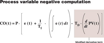 圖1:傳統的PID公式通過對誤差信號進行微分來計算微分項:e(t) = SP(t) - PV(t),其中PV(t)為t時刻的過程變量,SP(t)是設置值,CO(t)為控製器的全部輸出,P、TI及TD 則分別為定義比例、積分及微分項的“整定常數”。 但不幸的是,積分作用並不能保證實現完美的反饋控製。如果積分作用過強,則PI控製器可能引起 “閉環不穩定”(參見CONTROL ENGINEERING 2000年5月刊 “控製器必須以閉環穩定性來平衡性能”一文)。控製器也可能對誤差進行“過校正”,從而引起新的、甚至更大的反向誤差。當發生這種情況時,控製器最終將在“完全開”及“完全關”之間來回驅動其輸出,即開始出現所謂的“振蕩”現象。