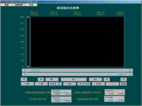 選定硬件設備後,需要按照如下的順序安裝熱備係統: ■安裝本地站和遠程站的電源模塊,CPU,RIO處理器,hot standby 模塊,TCP/IP模塊到背板,需要注意的是熱備係統兩個底板上安裝的模板種類和順序必須一致。兩個CPU地設備地址設定必須相同。兩個Ethernet模塊的IP地址設定必須相同。hot standby 模塊的指定滑動開關必須一個設定為A,另外一個設定為B. ■連接網絡,包括安裝RIO網絡和Ethernet網絡,按照網絡結構圖,分別安裝RIO處理器和遠程站之間的分支器和F接頭,連接RIO站間的同軸電纜,Ethernet交換機和網線; ■連接兩個hot standby 模塊之間的光纖。 編程和上位監控係統 首先確定編程和上位監控係統與PLC之間選擇TCP/IP的通訊協議。組態軟件Concept和上位監控軟件都支持TCP/IP的通訊協議,隻要將網絡搭建起來即可。遷鋼公司7000立方米風機熱備係統選用TCP/IP的通訊協議,需要的主要設備如下: ■編程和上位監控係統微機需配備Ethernet網卡; ■為了與熱備的PLC通訊,需要安裝Ethernet交換機; 另外,為了開發出理想的監控係統,選擇的監控軟件是美國TCPWonderware公司開發的InTouch8.0。InTouch是一個集成的、基於組CP/IP件的MMI係統――FactorySuite 2000中的一個核心組件。它具有美觀的HMI(人機接口界麵)和麵向對象的圖形開發環境,能夠高效、快捷地配置用戶的應用程序。其在穩定性,開放性,網絡功能,數據庫功能等方麵都具有很大的優越性。使用INTOUCH開發的監控畫麵包括顯示係統工藝過程的主畫麵,潤滑係統,軸振係統,軸位移係統等監控畫麵,以及報警、曆史曲線、實時曲線和報表等。係統的主要監控界麵如圖1,圖2,圖3,圖4所示。