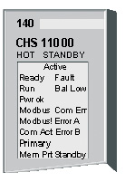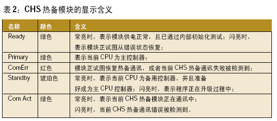 圖9:CHS 熱備模塊的顯示麵板 另外,還需要設定Hot Standby 擴展屬性,Hot Standby 擴展屬性包括的內容如圖8所示: 使用Concept軟件提供的Hot Standby擴展屬性組態界麵指定Hot Standby如下屬性: ■指定Hot Standby 命令寄存器參數; ■定義非傳送區域地址範圍,以減少CPU的掃描周期; ■定義CPU啟動後的工作狀態,相互熱備的CPU哪一個處於ONLINE狀態; ■定義處於熱備的CPU在程序發生不匹配時所產生動作,是由熱備轉為自動離線還是由熱備轉換為運行; ■定義當相互熱備的CPU工作狀態相互切換時要交換設備地址的通訊口,包括MODBUS口1,2,3; ■使能或者禁止邏輯映象按鈕忽略; ■定義執行邏輯升級時CPU所采取的處理方式,可以選擇“不用停機”也可以選擇“使用停機”方式; 完成上述的硬件配置和設定工作之後,分別將項目的配置下裝到兩個CPU中,熱備係統就已經建立起來。需要注意的是在向CPU中下裝組態時,需要先將兩個CPU的備用電池取下,至少10分鍾以上,以確保CPU在下裝組態之前存儲器中沒有任何數據。 熱備PLC係統常見故障及處理 熱備係統的硬件網絡結構圖如圖1所示,熱備CPU通過高速光纜連接,CPU的每個掃描周期均以10M通訊速率,實時由主CPU向備CPU傳輸數據及狀態信息,熱備係統具有自動程序下裝功能,快速、有效隻需下裝一次程序,配置不需要編程工作,CHS模塊熱更換-無停機時間。 CHS熱備模塊的顯示麵板如圖9所示,其主要顯示燈含義如表2。