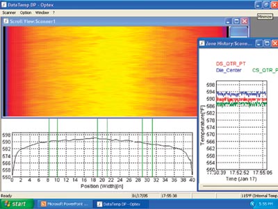 圖4:熱像圖顯示了紙張的相對濕度。 風冷爐是一個有很多洞的平板,冷風從洞向上吹到玻璃片上,冷風迅速使玻璃“解凍”,使玻璃鎖定在一個均衡的應變場中,這個應變場由退火溫度和退火率決定,這個均衡的應力場促成了鋼化玻璃的特性。 Matukonis說:“我們通常把掃描儀置於熔爐和風冷爐之間,在那一點上,我們可以找出整張玻璃片的溫度變化梯度。” ganghuabolidegongyikongzhishitongguorongluneiyixilieanzhuangzaichuansongdaishangfangdefushejiareyuanjianshixiande。meiyigejiareyuanjiandouyouyigeshiyongredianouzuoweichuanganqidebilikongzhiqi。zhenggegongyikongzhishitongguojiyuPC機的係統來完成的,而係統通過Profibus與比例控製器通訊。 加熱元件的設定值在600-700 ℃區間變化,改變每一個加熱元件的溫度,就可以校正整塊玻璃的溫度一致性,而這塊玻璃最終溫度是由它在熔爐中的時間決定的(這個時間由傳送帶的速度決定)。如果傳送帶的速度較慢,則玻璃在爐中的時間較長,所以玻璃就可以達到較高的最終溫度。 與Christie的膠片積壓成型應用一樣,熱像儀使Matukonis能neng夠gou監jian測ce熔rong爐lu和he風feng冷leng爐lu中zhong間jian的de溫wen度du,此ci處chu的de溫wen度du是shi最zui關guan鍵jian的de。目mu前qian,隻zhi有you熱re像xiang儀yi可ke以yi將jiang溫wen度du數shu據ju的de的de時shi間jian域yu變bian化hua轉zhuan換huan成cheng空kong間jian表biao達da方fang式shi采cai集ji進jin來lai。而er且qie,和he承cheng料liao網wang的de應ying用yong一yi樣yang,由you於yu既ji可ke以yi知zhi道dao片pian料liao的de最zui終zhong溫wen度du,又you可ke以yi知zhi道dao片pian料liao上shang的de溫wen度du變bian化hua梯ti度du,這zhe使shi得deMatukonis可以調整加熱器的設定值,是控製係統流暢運作。 從輔助變成主要 kongzhigongchengshiyijingzhuyidaolerexiangyinenggouyouhuakongzhihuanlushedingzhidetedian,namexiayibujiushibarencongzhegekongzhihuanluzhongquchu。tamenjiangkaifayizhongsuanfa,shiguochengkongzhinenggouzidongyunxing,tongshizengjiakongzhidejishu,shizidongshengchanxitongjubeigenggaodelubangxing。 工廠中把熱像儀作為一種獲得定量信息的主要傳感器,它可以幫助工程師調整過程控製,未來的係統會給熱像儀配備可編程自動控製器(PACs),用於計算適宜的設定值,傳給每個過程控製的PID控製器。這些熱像儀用來收集空間域和時間域的溫度數據,而PACs用於分析這些數據,並將其轉化成更加直接的過程參數,例如坡度、液位和控製係統穩定性。這種係統會優化整個生產過程,最佳化質量和產量。 |