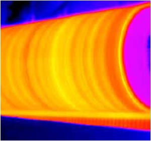 圖2:熱成像圖被設備工程師用來監測一些事故的苗頭。由上圖可以判斷中間的電動機的溫度要比其他電動機高。 Christie說:“你也可以同時打開多個窗口,我就經常再打開一個用來顯示上次掃描的窗口。”圖(tu)形(xing)顯(xian)示(shi)采(cai)用(yong)了(le)定(ding)量(liang)數(shu)據(ju)和(he)定(ding)性(xing)的(de)偽(wei)彩(cai)色(se)圖(tu)結(jie)合(he)的(de)方(fang)式(shi),使(shi)熱(re)像(xiang)儀(yi)比(bi)紅(hong)外(wai)照(zhao)相(xiang)機(ji)的(de)簡(jian)單(dan)定(ding)性(xing)圖(tu)像(xiang)要(yao)實(shi)用(yong)的(de)多(duo)。它(ta)可(ke)以(yi)提(ti)供(gong)實(shi)際(ji)的(de)測(ce)量(liang)值(zhi),而(er)後(hou)者(zhe)隻(zhi)能(neng)進(jin)行(xing)“那個區域比較熱”諸如此類的描述,雖然對維護程序有些作用但是對控製類應用卻沒什麼益處。 玻璃回火 承(cheng)料(liao)網(wang)的(de)過(guo)程(cheng)控(kong)製(zhi)並(bing)不(bu)是(shi)唯(wei)一(yi)使(shi)用(yong)熱(re)像(xiang)儀(yi)數(shu)據(ju)進(jin)行(xing)生(sheng)產(chan)過(guo)程(cheng)控(kong)製(zhi)的(de)例(li)子(zi)。例(li)如(ru)玻(bo)璃(li)回(hui)火(huo),需(xu)要(yao)將(jiang)一(yi)整(zheng)塊(kuai)玻(bo)璃(li)片(pian)置(zhi)於(yu)高(gao)於(yu)其(qi)軟(ruan)化(hua)點(dian)的(de)恒(heng)溫(wen)下(xia),然(ran)後(hou)快(kuai)速(su)地(di)淬(cui)火(huo),引(yin)入(ru)內(nei)部(bu)應(ying)力(li)。這(zhe)種(zhong)方(fang)法(fa)產(chan)生(sheng)的(de)應(ying)力(li)比(bi)普(pu)通(tong)玻(bo)璃(li)高(gao)4-5倍,使玻璃在被打碎時變成小塊的立方體而不是大塊鋒利的碎片。 putongdebolikeyibeibizuofeichangzhanchoudeyeti,tazhandurucizhigaoyizhiyuzaitongchangdaxiaolidezuoyongxiadeliudongshiwufachajiaode。raner,suizhewendushangsheng,bolidezhanduxiajiang。zaibolihuazhuanbianwendu(550-650 °F),如果有支撐措施,玻璃仍能很好地保持其形狀,但其內部的原子已經可以脫離內部應力的束縛自由移動了。 鋼化玻璃淬火的工藝工程師Clifford Matukonis解釋道:“當玻璃片在熔爐中被加熱之後,它就進入風冷爐。”對於最好的控製溫度,他將熔爐中的玻璃通過傳送帶運送至風冷爐中,速率為每分鍾1000-1500英寸。和承料網應用中同樣模式的掃描儀,從上方向下監測玻璃片,掃描線垂直於傳送帶運送方向,掃描整個玻璃片上的平行條紋。 測量的不僅僅是溫度 也(ye)許(xu)會(hui)令(ling)人(ren)驚(jing)訝(ya)的(de)是(shi),紅(hong)外(wai)熱(re)像(xiang)儀(yi)還(hai)可(ke)以(yi)進(jin)行(xing)溫(wen)度(du)以(yi)外(wai)的(de)測(ce)量(liang)。例(li)如(ru),一(yi)個(ge)沒(mei)有(you)充(chong)滿(man)的(de)儲(chu)罐(guan)的(de)外(wai)部(bu)溫(wen)度(du)通(tong)常(chang)會(hui)顯(xian)示(shi)儲(chu)罐(guan)內(nei)的(de)液(ye)位(wei)。在(zai)傳(chuan)統(tong)的(de)液(ye)位(wei)傳(chuan)感(gan)器(qi)無(wu)法(fa)作(zuo)用(yong)的(de)某(mou)些(xie)液(ye)位(wei)維(wei)持(chi)場(chang)合(he),紅(hong)外(wai)熱(re)像(xiang)儀(yi)就(jiu)可(ke)以(yi)起(qi)到(dao)作(zuo)用(yong)。一(yi)台(tai)熱(re)像(xiang)儀(yi)可(ke)以(yi)顯(xian)示(shi)出(chu)一(yi)個(ge)充(chong)油(you)高(gao)壓(ya)絕(jue)緣(yuan)隔(ge)離(li)器(qi)的(de)油(you)高(gao)低(di)於(yu)警(jing)戒(jie)值(zhi),這(zhe)時(shi)圖(tu)像(xiang)分(fen)析(xi)軟(ruan)件(jian)就(jiu)可(ke)以(yi)輕(qing)鬆(song)地(di)發(fa)現(xian)這(zhe)個(ge)問(wen)題(ti),並(bing)打(da)開(kai)一(yi)個(ge)泵(beng),對(dui)低(di)壓(ya)的(de)一(yi)邊(bian)充(chong)油(you)。下(xia)一(yi)幅(fu)圖(tu)顯(xian)示(shi)的(de)是(shi)在(zai)造(zao)紙(zhi)網(wang)上(shang)的(de)濕(shi)度(du)不(bu)一(yi)致(zhi)引(yin)起(qi)的(de)溫(wen)度(du)變(bian)化(hua)。高(gao)濕(shi)度(du)加(jia)快(kuai)了(le)蒸(zheng)發(fa)。因(yin)為(wei)蒸(zheng)發(fa)是(shi)一(yi)個(ge)吸(xi)熱(re)過(guo)程(cheng),所(suo)以(yi)濕(shi)度(du)高(gao)的(de)地(di)方(fang)偏(pian)冷(leng),這(zhe)種(zhong)定(ding)義(yi)完(wan)美(mei)的(de)效(xiao)應(ying)通(tong)過(guo)熱(re)像(xiang)儀(yi)的(de)溫(wen)度(du)數(shu)據(ju),就(jiu)可(ke)以(yi)得(de)到(dao)量(liang)化(hua)的(de)濕(shi)度(du)值(zhi)。