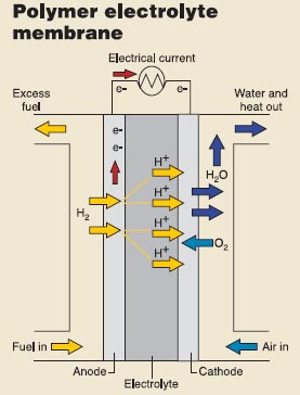 PEMFC(聚合類質子交換膜燃料電池)是最常見的以純氫和空氣為燃料的汽車燃料電池。這種電池具有效率高(60%),體積小,啟動速度快,工作溫度低,價格昂貴和對燃料純度要求高的特性。改造後的PEMFC可以以甲醇為燃料,為小型電子裝置供電。PEMFC 功率較小(小於10 千瓦),主要用做計算機係統的後備電源。