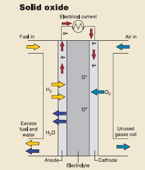 SOFC(固體氧化物燃料電池)采(cai)用(yong)堅(jian)硬(ying)的(de)非(fei)多(duo)孔(kong)陶(tao)瓷(ci)氧(yang)化(hua)鋯(gao)和(he)少(shao)量(liang)氧(yang)化(hua)釔(yi)的(de)混(hun)合(he)物(wu)為(wei)電(dian)解(jie)質(zhi)。由(you)於(yu)該(gai)種(zhong)電(dian)池(chi)的(de)工(gong)作(zuo)溫(wen)度(du)較(jiao)高(gao),因(yin)此(ci)無(wu)需(xu)貴(gui)金(jin)屬(shu)催(cui)化(hua)劑(ji)和(he)外(wai)部(bu)氣(qi)體(ti)配(pei)置(zhi),但(dan)是(shi)在(zai)首(shou)次(ci)啟(qi)動(dong)時(shi)需(xu)要(yao)一(yi)個(ge)很(hen)長(chang)的(de)預(yu)熱(re)周(zhou)期(qi)。雖(sui)然(ran)在(zai)總(zong)體(ti)上(shang)SOFC 仍屬於試驗性質,但其發電效率可達60%。 |