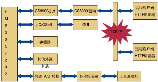 圖1:基於嵌入式WEB 的工業洗衣機遠程監控的總體結構圖 一般工業洗衣機的基本功能有:人機接口、電機控製、閥控製、洗衣機狀態檢測、溫(wen)度(du)檢(jian)測(ce)和(he)水(shui)位(wei)檢(jian)測(ce)。要(yao)實(shi)現(xian)遠(yuan)程(cheng)監(jian)控(kong)和(he)遠(yuan)程(cheng)故(gu)障(zhang)診(zhen)斷(duan),洗(xi)衣(yi)機(ji)還(hai)應(ying)具(ju)有(you)網(wang)絡(luo)功(gong)能(neng)。要(yao)實(shi)現(xian)智(zhi)能(neng)控(kong)製(zhi),即(ji)在(zai)洗(xi)滌(di)過(guo)程(cheng)中(zhong)控(kong)製(zhi)器(qi)能(neng)根(gen)據(ju)洗(xi)滌(di)物(wu)的(de)多(duo)少(shao)、髒(zang)汙(wu)程(cheng)度(du)和(he)髒(zang)汙(wu)性(xing)質(zhi)自(zi)動(dong)給(gei)出(chu)最(zui)佳(jia)洗(xi)滌(di)方(fang)案(an),這(zhe)就(jiu)要(yao)求(qiu)洗(xi)衣(yi)機(ji)具(ju)有(you)渾(hun)濁(zhuo)度(du)檢(jian)測(ce)和(he)布(bu)質(zhi)布(bu)量(liang)檢(jian)測(ce)功(gong)能(neng)。通(tong)過(guo)上(shang)述(shu)分(fen)析(xi),要(yao)實(shi)現(xian)工(gong)業(ye)洗(xi)衣(yi)機(ji)的(de)基(ji)本(ben)功(gong)能(neng)以(yi)及(ji)智(zhi)能(neng)化(hua)和(he)網(wang)絡(luo)化(hua),嵌(qian)入(ru)式(shi)係(xi)統(tong)至(zhi)少(shao)要(yao)有(you)以(yi)下(xia)接(jie)口(kou):LCD接口、觸摸屏接口(矩陣鍵盤接口、LED指示燈接口)、RS-232或RS485接口、UART接口、3路AD輸入、21路數字量輸出、8路數字量輸入(兩個可作為中斷源)及Ethernet接口,基於嵌入式WEB的工業洗衣機遠程監控的總體結構圖如圖1。 硬件設計 隨著嵌入式微處理器的發展,出現了Power PC、68K、MIPS、ARM等一係列低功耗、高性能的嵌入式CPU。因此選擇低成本的32位ARM係列嵌入式處理器,不但價格低廉,而且功耗低、處理速度快,應用前景廣泛,比較適合遠程監控需求。在工業洗衣機的遠程監控的係統中選用韓國現代公司的HMS30C7202(32位RISC 微處理器),這是一款具有高性價比的芯片。該芯片內集成了ARM7TDMI CPU核,存儲器管理單元(MMU),8KB的高速緩衝存儲器以及寫緩衝器。並具有豐富的接口:支持STN和TFT的LCD、觸摸屏、矩陣鍵盤、鼠標、LED指示燈、LAN、CAN、USB、RS-232、RS-485、紅外、24路繼電器輸出、10路數字量輸入、3路模擬量輸入和2路PWM輸出。為實現遠程網絡監控,係統底層網絡接口芯片采用CS8900A及外圍電路實現,本係統中網絡接口芯片CS8900A工作於16位模式。工業洗衣機遠程監控智能控製係統硬件框圖如圖2。