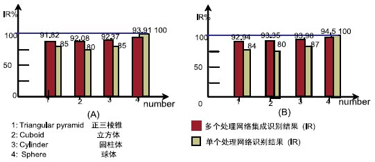 圖5:幾種障礙物的識別率比較 融合網絡決策 如圖4所示,子網絡1、2對同一目標有了各自的識別結果,利用集成網絡與融合決策網絡對障礙物進行判別。神經網絡集成作為一種新興的神經計算方法,具有比單一神經網絡係統更強的泛化能力,實際上就是利用神經網絡集成強的泛化能力對原始數據集進行類似於平滑去噪等作用的加工,使其包含更多的有助於預測的信息。經過集成與融合的多傳感器係統能完善地、精確地反映環境特征,消除信息的不確定性,提高傳感器的可靠性。 通過子網絡1、2對同一目標的識別,利用圖4融合決策網絡進行集成、決策,這樣可以得到一係列的值。如表1所示。 實驗結果分析 仿真實驗利用VC++6.0編程,BP網的輸入節點17個,輸出節點為4個,隱含層節點是16個,要識別的障礙物有球體、長方體、正三棱錐、yuanzhuti。dangyidongjiqirenyidongshi,chaoshengbofasheqimeigeyigegudingdeshijianduanjiufasheyicichaoshengbo。dangyidongjiqirenjinxingdaoshidangdeweizhishi,caiyangjiukaishile。zaiquyangguochengzhong,xiaocheraozhezhangaiwuzhuan,meige10°取qu樣yang一yi次ci。神shen經jing網wang絡luo用yong這zhe些xie訓xun練lian數shu據ju來lai進jin行xing離li線xian訓xun練lian。在zai測ce試shi中zhong,設she計ji兩liang組zu測ce試shi數shu據ju來lai驗yan證zheng係xi統tong的de有you效xiao性xing。仿fang真zhen中zhong用yong到dao的de這zhe些xie數shu據ju集ji如ru表biao1所示:移動機器人以0.45m/s的速度前進,識別率(Identify Ratio,簡稱IR)列於圖中。集成的BP網的識別率分別為:91.82%,92.08%,92.37%,93.91%和92.94%,93.35%,93.98%,94.5% (圖5中以實芯的框圖表示) 。當(dang)實(shi)驗(yan)次(ci)數(shu)增(zeng)加(jia)時(shi),識(shi)別(bie)率(lv)還(hai)會(hui)提(ti)高(gao)。但(dan)從(cong)我(wo)們(men)的(de)仿(fang)真(zhen)中(zhong)已(yi)可(ke)看(kan)出(chu),本(ben)方(fang)法(fa)是(shi)實(shi)用(yong)而(er)有(you)效(xiao)的(de),移(yi)動(dong)機(ji)器(qi)人(ren)可(ke)以(yi)實(shi)時(shi)地(di)識(shi)別(bie)出(chu)障(zhang)礙(ai)物(wu)類(lei)型(xing)。 在文獻[16]中利用了單個多層BP網絡對障礙物進行識別,同樣要識別的障礙物有正三棱錐、長方體、圓柱體、球體,應用了相同的訓練集合測試集 。論文中實驗結果單個BP網的識別率分別為:85%,80%,85%,100%和84%,80%,87%,100%。(圖5中以虛芯的框圖表示) 。 雖然在文獻[16]中對個別物體(比如球體)的識別率達到了100%,這正是單個網絡對簡單物體識別的優勢所在。對一些複雜的目標,特別是在實際的複雜環境中,集成的BP網絡將體現出較強的識別能力和較高的準確性。由這些數據可以看出集成的BP網絡要比單個多層BP網絡識別的精度高很多,識別的精確度也更科學。 結論 總之,利用本文提出的多種傳感器目標識別的融合結構,建立了兩個多層BP處理網絡,來處理CCD攝像機和超聲波測距傳感器的信號、hongwaichuanganqihechaoshengbocejuchuanganqidexinhao。congshiyanjieguofenxihebijiaokeyizhengmingjiyushenjingwangluojichengdeduochuanganqironghexinhaoshibieyaobidangewangluoyougenggaodejianzhuangxing,shibienengliyegenggao,zheyanggeijiqirenduimoshenghuanjingdebianshihejuecetigonglegengyoulidekexueyiju。 |