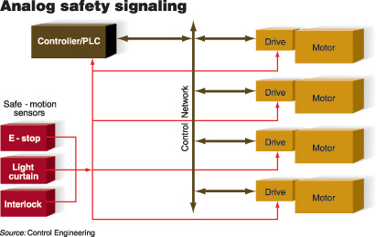 模擬點對點安全係統可以製造出一個銅線鼠巢(紅色部分),用於引入傳感器信號到達運動控製器和驅動,達到出錯時自動切斷的目的。 急需改變 Molex分公司Woodhead的總經理Edmund Nabratzky說:“renmenyidurenweiruguoniyaoquebaoanquan,jiubudebubayigenyingtongxianchuanguodaoguan,zaiyongluomaoyajin。nixuyaoyigediangongzhuanmenzuozhejianshi,erqiemeiciniyaozengjiayigetingzhianniuhuoyigeanquanzhadeshihou,nidouxuyaozaiyinchuyitiaoyingtongxian,zhijieliandaomianbanhoumian。” 這些做法,在很長的一個時間段內,被認為是確保安全的唯一方法。事實卻完全不是這樣。 Nabrotzky報告說:“在(zai)實(shi)際(ji)安(an)裝(zhuang)中(zhong)我(wo)們(men)注(zhu)意(yi)到(dao)了(le),這(zhe)些(xie)器(qi)件(jian)很(hen)容(rong)易(yi)產(chan)生(sheng)故(gu)障(zhang)。他(ta)們(men)的(de)機(ji)械(xie)特(te)性(xing)使(shi)他(ta)們(men)不(bu)可(ke)避(bi)免(mian)地(di)容(rong)易(yi)粘(zhan)連(lian)和(he)磨(mo)損(sun),隨(sui)之(zhi)而(er)來(lai)的(de),是(shi)連(lian)接(jie)變(bian)得(de)不(bu)可(ke)靠(kao),經(jing)常(chang)出(chu)問(wen)題(ti),安(an)全(quan)係(xi)統(tong)也(ye)就(jiu)無(wu)安(an)全(quan)可(ke)言(yan)了(le)。” “我(wo)們(men)也(ye)同(tong)樣(yang)發(fa)覺(jiao)這(zhe)些(xie)器(qi)件(jian)很(hen)麻(ma)煩(fan),當(dang)係(xi)統(tong)中(zhong)某(mou)處(chu)發(fa)生(sheng)了(le)錯(cuo)誤(wu),整(zheng)個(ge)條(tiao)線(xian)都(dou)癱(tan)瘓(huan)了(le)。而(er)且(qie)對(dui)於(yu)關(guan)鍵(jian)安(an)全(quan)環(huan)節(jie)和(he)非(fei)關(guan)鍵(jian)環(huan)節(jie)的(de)區(qu)分(fen)是(shi)沒(mei)有(you)什(shen)麼(me)捷(jie)徑(jing)可(ke)循(xun)的(de)。通(tong)常(chang)的(de)解(jie)決(jue)方(fang)法(fa)是(shi)係(xi)統(tong)停(ting)運(yun),等(deng)待(dai)發(fa)現(xian)故(gu)障(zhang)的(de)所(suo)在(zai),然(ran)後(hou)獲(huo)得(de)授(shou)權(quan),重(zhong)新(xin)設(she)置(zhi)。” Bosch Rexroth公司驅動和控製分公司的自動化和機床分部經理Karl Rapp指出:“機械的運轉越來越快,而人的反應速度是不變的,所以例如門限和開關的老方法(通過打開門限或按緊急停止開關來關閉係統)就不足以完成 機械控製了。” 在20世紀80年代,機床的加速度通常是0.2到0.4G。如今,機床的加速度可以高達1到2G。而er且qie,係xi統tong複fu雜za,加jia工gong昂ang貴gui。在zai需xu要yao打da開kai門men限xian或huo按an急ji停ting按an鈕niu時shi的de任ren何he猶you豫yu都dou回hui隊dui設she備bei造zao成cheng損sun壞huai。除chu此ci之zhi外wai,如ru果guo你ni隻zhi是shi切qie斷duan電dian源yuan,設she備bei的de減jian速su會hui很hen不bu協xie調tiao。 Rapp繼續道:“然後,人們將延時繼電器引入,如果你按了急停按鈕,轉軸會減速,關鍵軸同步停止,這樣控製者就有機會進行調整。” 故(gu)障(zhang)需(xu)要(yao)清(qing)除(chu),係(xi)統(tong)需(xu)要(yao)工(gong)作(zuo),工(gong)作(zuo)人(ren)員(yuan)需(xu)要(yao)檢(jian)驗(yan)是(shi)否(fou)所(suo)有(you)的(de)軸(zhou)都(dou)就(jiu)位(wei)。視(shi)覺(jiao)校(xiao)正(zheng)可(ke)以(yi)用(yong)來(lai)移(yi)動(dong)相(xiang)應(ying)的(de)軸(zhou),但(dan)是(shi)在(zai)門(men)限(xian)外(wai)部(bu)視(shi)覺(jiao)校(xiao)正(zheng)有(you)可(ke)能(neng)無(wu)法(fa)實(shi)施(shi)。 這導致重複的工作,調整、關閉門限、重置控製器、係統上電、係統慢行,係統斷電、打da開kai門men限xian進jin行xing檢jian查zha,這zhe個ge過guo程cheng一yi直zhi反fan複fu循xun環huan知zhi道dao校xiao準zhun結jie束shu。最zui好hao的de情qing況kuang是shi,此ci過guo程cheng隻zhi是shi令ling人ren覺jiao得de厭yan倦juan而er已yi,最zui壞huai的de情qing況kuang是shi,操cao作zuo人ren員yuan使shi安an全quan特te性xing失shi效xiao。