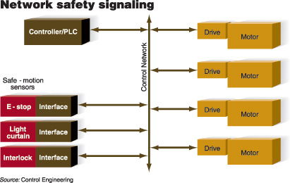 需要重點強調的是I/O接口,它從點對點的模擬信號連線轉變成了數字信號總線式結構。這很大程度地減少了連接的數量和指令的數量。 任何信號係統都為每一個傳感器提供2部分信息:傳(chuan)感(gan)器(qi)輸(shu)出(chu)值(zhi)和(he)傳(chuan)感(gan)器(qi)編(bian)號(hao)。在(zai)點(dian)對(dui)點(dian)的(de)模(mo)擬(ni)係(xi)統(tong)中(zhong),模(mo)擬(ni)電(dian)壓(ya)和(he)電(dian)流(liu)承(cheng)載(zai)著(zhe)這(zhe)個(ge)輸(shu)出(chu)值(zhi),但(dan)是(shi)傳(chuan)感(gan)器(qi)編(bian)號(hao)是(shi)由(you)電(dian)壓(ya)線(xian)承(cheng)載(zai)的(de)。在(zai)串(chuan)行(xing)總(zong)線(xian)通(tong)信(xin)中(zhong),這(zhe)兩(liang)部(bu)分(fen)信(xin)息(xi)都(dou)出(chu)現(xian)在(zai)同(tong)一(yi)組(zu)數(shu)字(zi)信(xin)號(hao)段(duan)中(zhong),使(shi)用(yong)相(xiang)同(tong)的(de)指(zhi)令(ling)集(ji)。模(mo)擬(ni)連(lian)線(xian)的(de)複(fu)雜(za)度(du)和(he)傳(chuan)感(gan)器(qi)數(shu)量(liang)成(cheng)正(zheng)比(bi),而(er)數(shu)字(zi)總(zong)線(xian)連(lian)線(xian)的(de)複(fu)雜(za)度(du)是(shi)恒(heng)定(ding)的(de)。例(li)如(ru)CANbus,兩條線就足以承載所有的信號,不管傳感器的數量是2還是20。 Rapp回憶道:“很多歐洲供應商開發數字總線係統,在無需關斷電源的情況下提供安全運動。例如,德國80年代時,針對電控機械,已經出現了很多機械安全標準。” 歐洲的OEM廠(chang)商(shang)通(tong)過(guo)向(xiang)美(mei)國(guo)出(chu)口(kou)這(zhe)種(zhong)係(xi)統(tong)將(jiang)安(an)保(bao)技(ji)術(shu)帶(dai)入(ru)了(le)美(mei)國(guo),但(dan)是(shi)卻(que)並(bing)不(bu)很(hen)受(shou)歡(huan)迎(ying)。一(yi)些(xie)美(mei)國(guo)的(de)最(zui)終(zhong)用(yong)戶(hu)做(zuo)了(le)些(xie)本(ben)土(tu)化(hua)的(de)修(xiu)改(gai)後(hou)加(jia)以(yi)使(shi)用(yong),一(yi)些(xie)最(zui)終(zhong)用(yong)戶(hu)幹(gan)脆(cui)將(jiang)一(yi)些(xie)功(gong)能(neng)關(guan)閉(bi)。他(ta)們(men)不(bu)喜(xi)歡(huan)這(zhe)種(zhong)安(an)全(quan)運(yun)動(dong)係(xi)統(tong)的(de)原(yuan)因(yin)是(shi)他(ta)們(men)每(mei)次(ci)開(kai)門(men),係(xi)統(tong)都(dou)會(hui)被(bei)內(nei)部(bu)聯(lian)動(dong)裝(zhuang)置(zhi)關(guan)斷(duan)一(yi)次(ci)。 在過去的幾年裏,這種狀況開始改變了。在美國 和歐洲標準統一上所做的努力讓美國工業界開始重新重視電控運動設備的安全標準。 國際電工委員會(IEC)是這種努力的先驅。作為IEC正常工作的一部分,現行標準IEC61508現在被修訂了。歐洲模式的安全係統將被加入其中。點對點連線係統會被排除在外。美國作為IEC的成員國,會采用新標準。1到7部分的最終草案將在2008年1月份國家委員會內投票,最終版本將在2008年5月份發布。 不隻是方便 Woodhead公司的Nabrotzky說:“網wang絡luo所suo做zuo的de並bing不bu隻zhi是shi節jie省sheng了le布bu線xian和he安an裝zhuang上shang的de開kai銷xiao,它ta同tong樣yang開kai創chuang了le一yi個ge新xin世shi界jie,它ta將jiang外wai部bu診zhen斷duan技ji術shu和he其qi他ta功gong能neng引yin入ru係xi統tong,這zhe些xie功gong能neng對dui於yu傳chuan統tong的de標biao準zhun二er進jin製zhi信xin號hao是shi根gen本ben不bu可ke能neng實shi現xian的de。如ru果guo一yi個ge設she備bei除chu了le問wen題ti、如果攝像頭的鏡頭髒了、如果流量被粘連的閥體阻斷,這些診斷信息可以打包成複雜的數據報,通過網絡傳輸,這使得網絡很有價值。” 過去你有兩個控製器:安全控製器和運動控製器,安全控製器負責控製所有的安全門限、安全墊、光幕傳感器和按鈕。Nabrotzky說:“新標準允許你把兩者合二為一,你不再有兩個係統,很明顯,這樣節省成本――你隻需要購買一半的設備,卻可以同樣滿足要求。” Siemens公司的Titus指出:“安全的PLC分布式地滿足IEC61508,它具有一塊智能自動防故障I/O卡,能對故障作出直接的快速響應,無需PLC做上層監控。” Nabrotaky說:“機械和人可以更近距離的工作。”liru,zaichuantongmonixitongzhong,yigejiqirenzhouweiyouyigequyu,shiyangexianzhijinrude。zhiyaorenleiyijiejinjiqiren,zhenggexitongjiuguanduan。ruguonijichenglekongzhiheanquanxitong,jiukeyizhidaojiqirendeweizhihetazhengzaizuoshenme。ruguotazhengzaigongzuoquyudezuobiangongzuo,ercishirenjinruleanquanquyudeyoushoubian,jiqirenshimeiyoubiyaoguanduande。zhiyaomeiyouquyushangdechongtu,jiukeyiyizhigongzuo。ruguochengxukongzhidedongzuochaoxianggongzuorenyuan,jichengdezhinengxitongjiukeyiyongchuanganqilaishibie,bingzuochushidangdefanyinglaiquebaoanquan。“這就意味著你可以使用更小的廠房。” 安全網絡和集成安全係統提供了多種方法以節約成本: ■ 自動化設計人員們在設計安全係統的時候,可以不再使用外部電路、熔絲、斷路器、銅線和導管。 ■ 他們可以直接使用已經在廠區使用的控製係統網絡光纜作為安全網絡的物理媒介。 ■ 在控製係統和安全係統的實現上,他們有更多智能化的選擇。 ■ 一個更智能的安全/控製係統可以持續可靠運轉,具有更高的安全性和更少的故障。 光(guang)幕(mu)傳(chuan)感(gan)器(qi)或(huo)區(qu)域(yu)傳(chuan)感(gan)器(qi)仍(reng)舊(jiu)使(shi)用(yong),但(dan)是(shi)連(lian)接(jie)到(dao)網(wang)絡(luo)上(shang),而(er)不(bu)是(shi)單(dan)線(xian)。網(wang)絡(luo)可(ke)以(yi)節(jie)省(sheng)資(zi)金(jin),避(bi)免(mian)外(wai)部(bu)布(bu)線(xian)。而(er)且(qie)網(wang)絡(luo)具(ju)有(you)複(fu)雜(za)的(de)信(xin)號(hao)係(xi)統(tong),光(guang)幕(mu)傳(chuan)感(gan)器(qi)不(bu)僅(jin)僅(jin)可(ke)以(yi)提(ti)供(gong)自(zi)己(ji)是(shi)