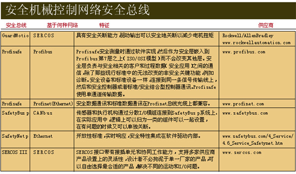 網絡安全係統使用現有的高速數據網絡來承載安全信號和控製信號。智能傳感器可以發送狀態信息和出錯信息。 新標準 現代機械安全技術在歐洲發展的很完善,正在向世界其它地方擴張,它包括兩個基本組件。 安全網絡是基於標準機械控製網絡的安全性版本,例如CANbus,加上協議的特征,使之能夠可靠地承載要求安全的信號。 集成安全的概念是將安全特性集成於控製器和驅動軟硬件中,例如可以將機器速度減慢至人類速度的能力。 Rapp回憶道:“在90年(nian)代(dai)中(zhong)期(qi),很(hen)多(duo)最(zui)終(zhong)用(yong)戶(hu)致(zhi)力(li)於(yu)推(tui)進(jin)係(xi)統(tong)的(de)安(an)全(quan)化(hua),這(zhe)使(shi)得(de)設(she)置(zhi)和(he)恢(hui)複(fu)變(bian)得(de)安(an)全(quan)了(le)。我(wo)們(men)開(kai)發(fa)了(le)一(yi)種(zhong)雙(shuang)通(tong)道(dao)策(ce)略(lve),控(kong)製(zhi)器(qi)在(zai)一(yi)個(ge)通(tong)道(dao)上(shang),驅(qu)動(dong)器(qi)在(zai)另(ling)一(yi)個(ge)通(tong)道(dao)上(shang)。連(lian)接(jie)到(dao)驅(qu)動(dong)器(qi)上(shang)的(de)指(zhi)令(ling)變(bian)成(cheng)了(le)數(shu)字(zi)信(xin)號(hao),這(zhe)樣(yang)控(kong)製(zhi)器(qi)上(shang)的(de)I/O通道就變成了安全通道。”