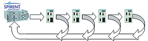 圖2:275字節Modbus TCP響應測試結果 測試設置 測試采用多台有管理和無管理的工業以太網交換機進行。所用的數據包生成器為Spirent Smartbits 200,如圖3所示。 Modbus請求和Modbus響應數據包在SmartBits 200的輸出接口發出後分別經過數量遞增的交換機傳遞,之後再由SmartBits 200的輸入接口接收,以測量往返時間。每個數據包在各幀之間都有標稱96比特的包間時隙(IPG),以模擬實際的數據流。所耗費時間以SmartBits 200上的單係統時鍾基準測量。由於專門用於試驗的SmartBits采用專業化ASIC來生成流量,其數據流會保持恒定,不存在軟件型數據包發生器中的操作係統波動的影響。