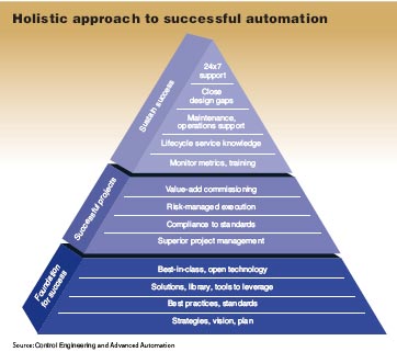 圖3:可以預期,根據集成商提供的應用策略,係統性能會隨著時間下降。所以要采取 措施加快應用、彌補設計差距、保證項目收益。 如果你並不想這麼幹,那Zeigenfuse就jiu建jian議yi你ni往wang圖tu上shang的de更geng高gao階jie層ceng裏li去qu尋xun找zhao集ji成cheng商shang。處chu於yu第di二er個ge階jie層ceng的de集ji成cheng商shang除chu了le技ji術shu還hai提ti供gong服fu務wu,他ta們men不bu僅jin派pai遣qian技ji術shu工gong作zuo人ren員yuan進jin行xing指zhi導dao而er且qie還hai提ti供gong項xiang目mu在zai技ji術shu方fang麵mian的de改gai進jin方fang法fa和he實shi踐jian經jing驗yan。而er最zui上shang層ceng的de集ji成cheng商shang則ze會hui教jiao你ni如ru何he控kong製zhi人ren為wei因yin素su。 最佳係統集成商 Control Engineering2006年12月期刊登了自動化集成商指南幫你尋找經驗豐富的集成商。指南羅列了“最佳係統整合”的詳細說明,並刊登了我們評選出的最佳係統集成商的信息: * Concept Systems(年利潤高達1000萬美元) www.conceptsystemsinc.com * Advanced Atutomation(每年利潤達1000萬~5000萬美元) www.advancedautomation.com * The Benham Companies LLC(年利潤超過5000萬美元) www.benham.com 頂級集成商能夠為用戶帶來一個可持續的生產效益。Zeigenfuse先生指出。“他們不僅僅隻是將一個項目完成了事,而是能夠幫助用戶在自動化項目的投資獲得最大化的收益。”等級越高,可供選擇的集成商就越少,聘用他們的費用也越昂貴,不過他們所能產生的價值也越巨大。 5.對於這個項目你們打算采用哪些技術? 盡jin管guan決jue定ding項xiang目mu成cheng功gong與yu否fou的de風feng險xian因yin素su並bing不bu僅jin僅jin隻zhi取qu決jue於yu技ji術shu,然ran而er,在zai選xuan擇ze可ke信xin賴lai的de集ji成cheng商shang時shi用yong戶hu必bi須xu要yao考kao慮lv技ji術shu問wen題ti以yi確que保bao項xiang目mu成cheng功gong。所suo以yi“為什麼集成商建議采用這種方案?”這個問題還是值得一問的。 係統集成電子信息 如果您是係統集成商或經常與他們打交道,您可以選擇訂閱Control Engineering每月發放的係統集成Eletter, 它將免費發送至您的個人電腦中,涵蓋了SI新聞,最新的以太網、無線網絡以及其他工業網絡的相關產品信息;機箱、接頭、連接線以及其他控製元器件產品信息;電源保護和控製產品信息等。訂閱請訪 www.controleng.com。 據Williams的說法就是:“用yong戶hu要yao問wen問wen這zhe到dao底di是shi自zi己ji的de還hai是shi集ji成cheng商shang的de最zui佳jia解jie決jue方fang案an。有you一yi部bu分fen集ji成cheng商shang可ke能neng因yin為wei價jia格ge優you惠hui或huo是shi偏pian好hao喜xi愛ai某mou種zhong平ping台tai而er選xuan擇ze采cai用yong某mou種zhong技ji術shu。”他還補充建議用戶問問集成商與項目產品供應商之間是什麼樣的關係。 Gurney先(xian)生(sheng)則(ze)建(jian)議(yi)用(yong)戶(hu)選(xuan)擇(ze)處(chu)於(yu)行(xing)業(ye)龍(long)頭(tou)地(di)位(wei)的(de)集(ji)成(cheng)商(shang),而(er)非(fei)擁(yong)有(you)專(zhuan)利(li)技(ji)術(shu)的(de)集(ji)成(cheng)商(shang)進(jin)行(xing)合(he)作(zuo)。他(ta)認(ren)為(wei)用(yong)戶(hu)采(cai)用(yong)模(mo)塊(kuai)和(he)開(kai)放(fang)式(shi)結(jie)構(gou)的(de)產(chan)品(pin)會(hui)更(geng)好(hao)些(xie)。“采用標準的模塊化硬件平台就能多渠道地獲得技術支持。用戶一旦購買了專利係統,他們也就隻能鎖定唯一的供應商提供技術支持了。” 他還補充到:“將jiang離li散san的de硬ying件jian整zheng合he並bing不bu是shi最zui大da的de問wen題ti。整zheng合he不bu同tong的de硬ying件jian會hui帶dai來lai許xu多duo隱yin性xing支zhi出chu,尤you其qi在zai維wei修xiu方fang麵mian。解jie決jue整zheng合he問wen題ti的de方fang法fa也ye多duo種zhong多duo樣yang,不bu過guo你ni必bi須xu選xuan擇ze適shi合he你ni係xi統tong結jie構gou的de方fang案an。” 很不幸,並不是所有的技術都具有交互通用性,因此某些部分的整合是必須的,不過這屬於係統集成商的職責範圍。Williams先生說聰明的做法就是找一個集成商,他需做到滿足你生產需要的同時盡量減少特殊化改動。 Zeigenfuse則采用“整體化的”方法來選擇技術。“每個優秀的方案都是具有標準化的特點和功能。為了確保成功的果實,而不讓生產效益發生衰退現象,你必須要有一套長期的方案。”他建議用戶不僅僅要選擇最好的開放技術,還應該製定一整套改進和維修方案以保證自動化技術發揮其最大的功效。(參見圖“自動化項目成功的整體化方案”) 補充問題:項目完成後,我們還能夠獲得哪些服務? 項目啟動之初大家可能都沒有考慮過項目完成之後的一些事宜。Williams、Gurney和Zeigenfuse一(yi)致(zhi)認(ren)為(wei)自(zi)動(dong)化(hua)項(xiang)目(mu)要(yao)取(qu)得(de)長(chang)期(qi)的(de)成(cheng)功(gong)關(guan)鍵(jian)的(de)一(yi)點(dian)就(jiu)是(shi)要(yao)會(hui)為(wei)將(jiang)來(lai)做(zuo)打(da)算(suan)。不(bu)過(guo)事(shi)先(xian)的(de)確(que)很(hen)難(nan)預(yu)測(ce)指(zhi)定(ding)的(de)係(xi)統(tong)集(ji)成(cheng)商(shang)在(zai)將(jiang)來(lai)的(de)技(ji)術(shu)升(sheng)級(ji)和(he)完(wan)善(shan)中(zhong)表(biao)現(xian)會(hui)如(ru)何(he)。 Williams建議用戶詢問以下問題,“對於係統未來的升級和擴展你們有怎樣的移植計劃?”,“所用的軟硬件組件都具有開放性的構架嗎?或者我需要購買某種專用的硬件/軟件嗎?”他同時指出用戶必須清醒地意識到未來係統的升級和擴展都會帶來額外的支出。優秀的集成商能夠對未來的這種