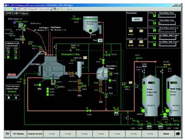 振波亞洲漿紙業有限公司在製漿ONP線過程控製係統中,采用了ABB旗下AC800M+S800 I/O 的800xA。整廠采用了19對AC800M PM864A控製器(冗餘),8架Connect Server服務器,3架Aspect Server服務器、2架Domain服務器以及1架用於作為殺毒軟件升級服務器(同時也兼做網絡數據備份)。8架CS服務器根據控製器所在的區域分為4對,倆倆冗餘。在上位服務器上使用了windows 2000 server操作係統,使用4.1版本的Industrial IT 800xA係統;13台操作站和3台工程師站使用windows XP操作係統,使用4.1版本的Control Builder M Professional作為下位控製器編程軟件和VB6.0+SP6作為DCS畫麵組態軟件。