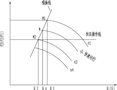 圖1:離心式氣體壓縮機喘振限直線及隨動防喘振控製操作線示意圖