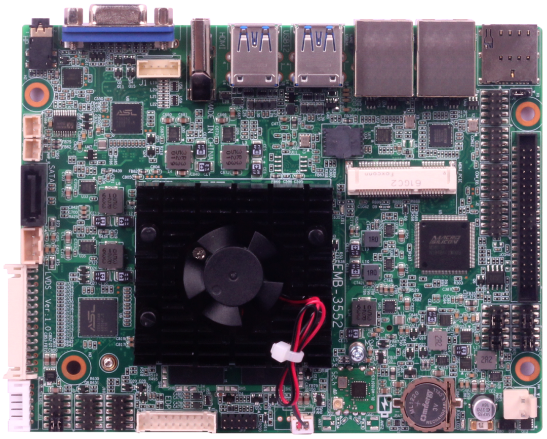 EMB-3552采用工業級加固設計,提供1* CPU_FAN插針接口可以增強散熱性能,,具備-20℃~70℃寬溫作業、抗電磁幹擾等複雜環境適應性,適用於各種工業/商業場景。