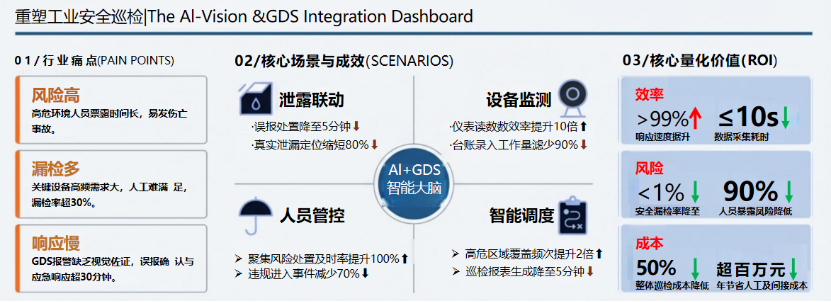 當前,大型能源、化工等流程工業高危區域設備密集,且易因腐蝕、泄漏引發生產事故,傳統人工巡檢長期受困於“漏檢率高、安全風險高、響應滯後”三大難題。立足行業需求,和利時創新打造《基於AI視覺與GDS聯動的智能巡檢解決方案》,以“GDS氣體泄漏報警+AI視頻智能複核與巡檢”為核心,構建“感知-接入-智能處理-應用-數據”五層閉環架構。方案針對現場“跑、冒、滴、漏”場景集成20餘種AI模型,可自動識別隱患,觸發後即時聯動GDS秒級報警,並支持AI視頻彈窗複核,實現從視頻采集、低延遲傳輸、智能分析到業務落地、數據歸檔的全流程管控。該方案落地應用後,運行效果顯著,成為工業4.0時代“AI+安全生產”的標杆範本。