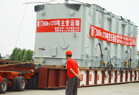 該變壓器由省電力大件運輸公司負責運輸,由海滄碼頭運至廈門500千伏變,運輸路程為56公裏,運輸9天,沿途需經過海滄、杏林、同安,經過15座橋梁,需排除郵電、通訊、電力、有線電視網絡線等空中障礙100多處。其中運輸難點為下穿廈漳高速公路鳳山立交橋,因高度受限必須采用卸車、拖越、裝車續運的方法前後就需3天時間,整個運輸過程約9天時間。目前,省超高壓局已完成了所有橋梁和路麵的加固和技術論證,預計6月10日開始運輸,6月18日運抵變電所內就位。