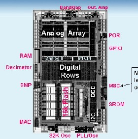 除Cypress此次上市的產品外,可編程模擬IC還有美國Anadigm的“FPAA(現場可編程模擬陣列)”和美國Lattice半導體的“ispPAC”等。這些產品的價格為10美元左右,而此次上市的PSoC的特點在於盡管集成了控製用微控製器和A-D轉換器,但成本卻不足2美元。通過集成微控製器,利用單芯片即可完成對來自模擬電路的信號控製。微控製器配備Cypress開發的8位CPU內核“M8”,工作頻率為24MHz。