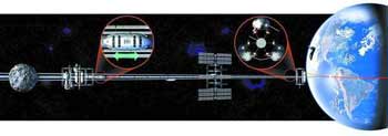 要yao想xiang建jian造zao這zhe種zhong太tai空kong電dian梯ti,就jiu必bi須xu把ba一yi個ge與yu地di球qiu同tong步bu旋xuan轉zhuan的de人ren造zao衛wei星xing放fang置zhi在zai承cheng載zai盤pan成cheng圈quan狀zhuang的de纜lan繩sheng的de軌gui道dao上shang,然ran後hou把ba纜lan繩sheng重zhong的de那na一yi端duan扔reng向xiang地di球qiu,同tong時shi另ling一yi端duan在zai太tai空kong中zhong展zhan開kai。而er電dian梯ti艙cang就jiu能neng夠gou從cong地di麵mian上shang爬pa上shang纜lan繩sheng,把ba人ren造zao衛wei星xing、kongjiantanceqishenzhitaikongguanguangzhecongyiduansongdaolingyiduan。gangkaishiyonglaifasonglanshengderenzaoweixingyinggainenggoutigongzugoudezhangli,yibiandiyipiyunzaigongjukeyishunlidaodataikong。zhexieshengjiangjinenggoujianglvdaiguidaogudingzailanshengdeliangduan,bingqieyikaocongdimianfashedejiguangzhuanhuanchengdediannengzuoweidonglijiayituidong。