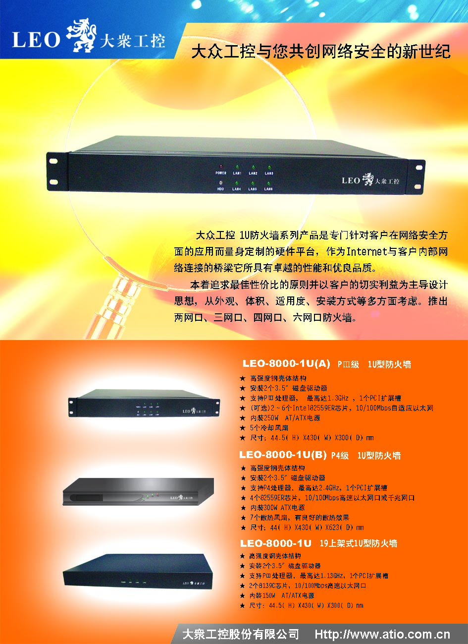 這款產品符合19”上架標準,采用1U超薄全鋼體結構,支持Pentium III /Celeron處理器,最高可上到1.3GHz,帶256KB高速二級緩存,可大幅提高係統的數據處理能力;采用高性能的Intel 815E chipset,支持133MHz外部總線頻率,係統的數據吞吐能力更強;集成6個Intel 10/100+(82559)高速以太網控製器,可以應付複雜的網絡數據交換;1U空間中最大可擴充2個3.5”磁盤驅動器,有效節省空間,機內還提供1 PCI(32bit/33MHz)擴展槽和擴展空間,以方便客戶不同擴充功能的需求。這款產品可為Internet服務供應商(ISP)及中小企業網絡用戶提供mail服務器、Web服務器、DNS服務器、FTP服務器、代理服務器、防火牆、網絡加密等各種網絡服務器、主機托管的最佳解決方案