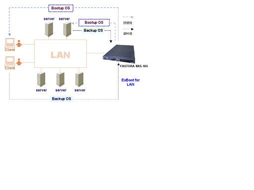 此外,ExBoot亦可使用於網絡環境中,不論是file level的LAN,以及block level的SAN,可以同時服務於個人、工作群組做係統備份及迅速還原。隻要備份目的地端的容量大於預備份的扇區即可施行,並可依使用者需求做完全備份(Full backup)、異動備份(Incremental backup)、同步備份、版本控製和排程設定,針對進階的企業用戶,亦可選購線上備份、數據庫備份功能。